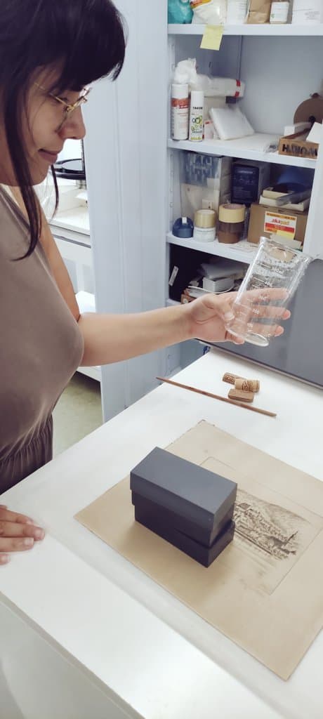 Ha aceptado los retos de intervenir en un grabado calcográfico, en probar nuevos métodos de limpieza aplicados al documento grafico por medio de geles rígidos (futuro tema de su tfg) y la limpieza tradicional de una encuadernación también del siglo XVI. Ha tenido interés en la intervención en un plano naval, así como en la realización, algo mas tediosa para todas, de los informes de trabajo correspondientes.