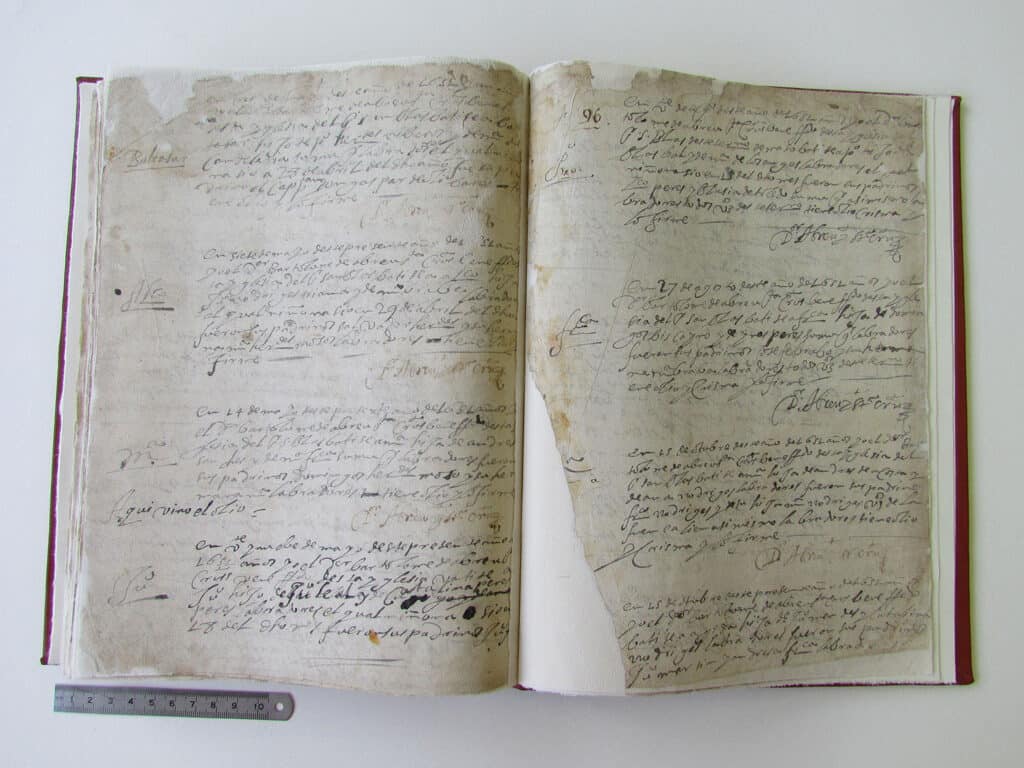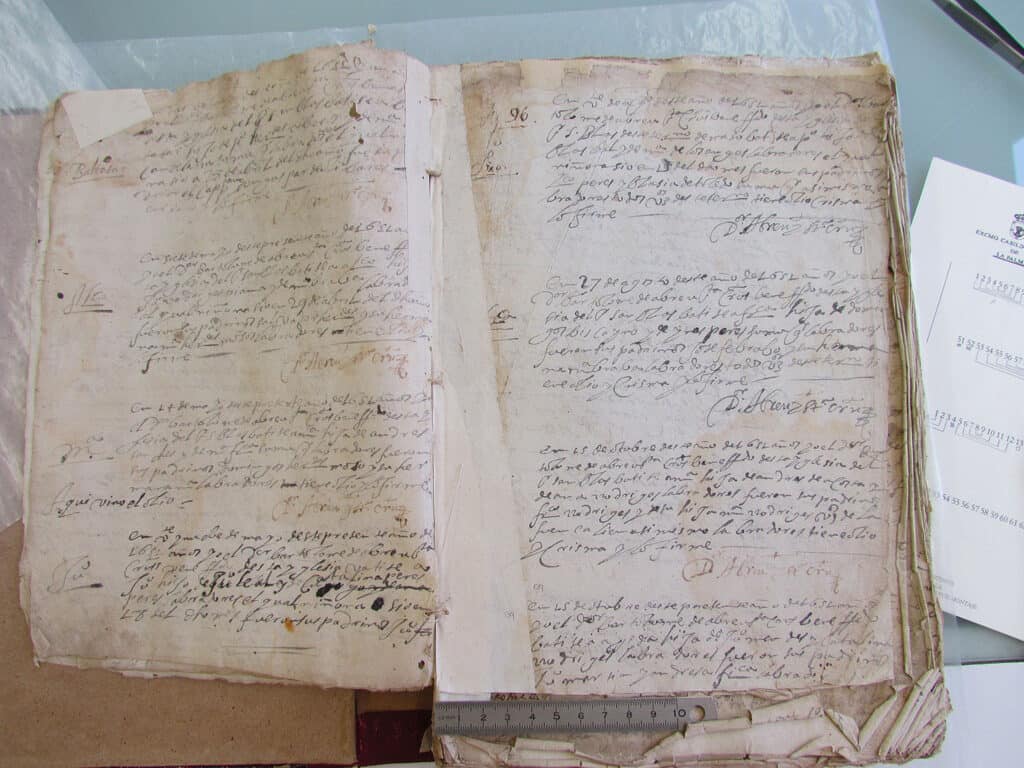 Una vez en el laboratorio, se comprobó que el libro había sido arreglado y reencuadernado en tapa suelta por Miguel Serra Cortina en 1926, dejando testigo de ello, y aunque no se rigió por los criterios actuales de restauración y preservación, sí impidió su mayor deterioro e incluso su pérdida, rescatando unos legajos sueltos, abandonados y casi perdidos que se encontraban en muy mal estado de conservación hasta el punto de peligrar su contenido.